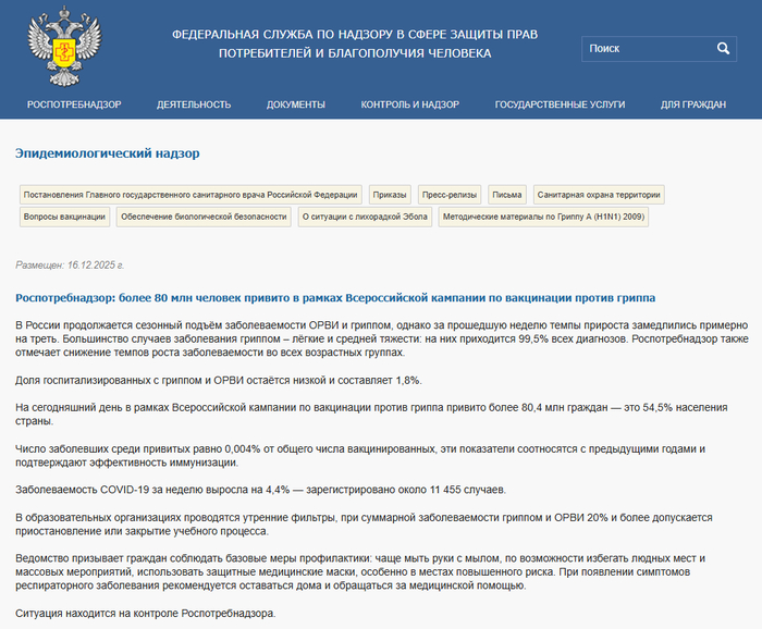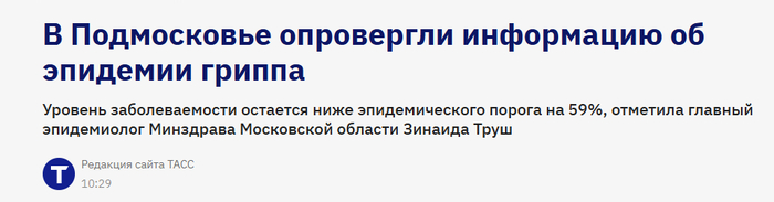 Никаких осложнений эпидемиологической ситуации нет, а слухи сильно преувеличены. Роспотребнадзор Московской области опроверг информацию о масштабной вспышке вируса. Главный внештатный эпидемиолог Минздрава Московской области Зинаида Труш объяснила, что «уровень заболеваемости остается ниже эпидемического порога почти на 60%» — ситуация благополучная.