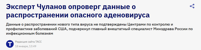 Это не так. Главный внештатный специалист Минздрава России по инфекционным болезням профессор Владимир Чуланов опроверг сообщения о вспышке опасного заболевания: «В настоящее время нет данных, свидетельствующих об угрозе пандемии, связанной с распространением аденовируса».