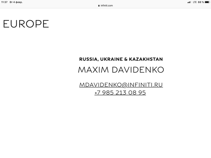Дальше начинается интереснее, представительство вообще отказывается со мной разговаривать, звонки в поддержку ничем не заканчиваются, дальше оператора меня отказываются с кем-то соединить, а сами операторы отвечают только, что вправе на что-либо отвечать, обращайтесь к ОД. На сайте Инфинити ком нашёл Контакты некого Максима, представителя Инфинити по РФ, Украине и Казахстану.