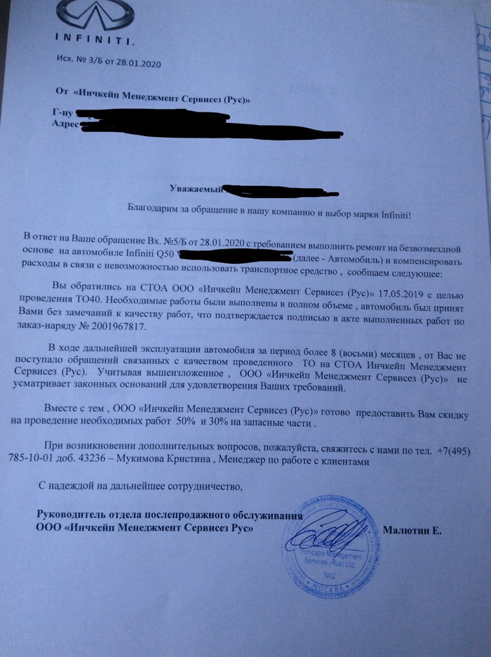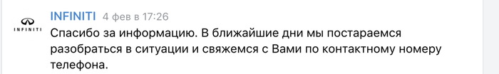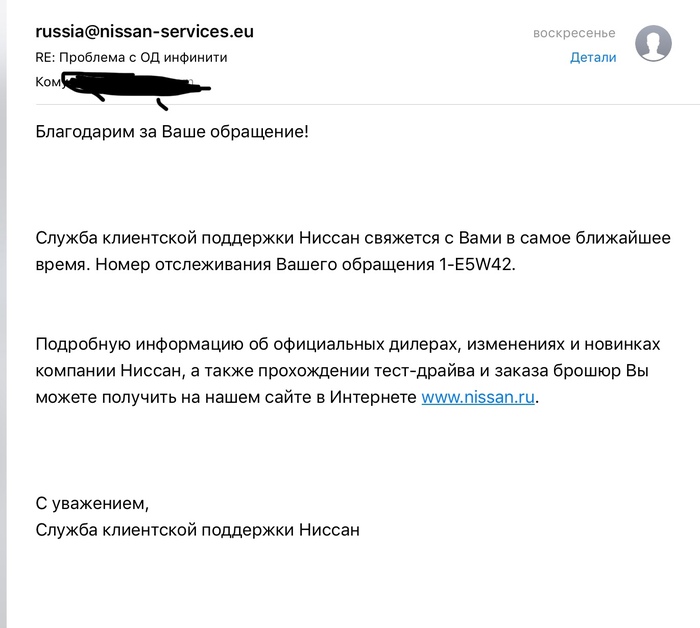 Дальше я начал долбить поддержку Ниссан по телефону, но меня так же перенаправляли на поддержку Инфинити, а там ответ тот же, мы не можем ничего комментировать, обращайтесь к ОД.