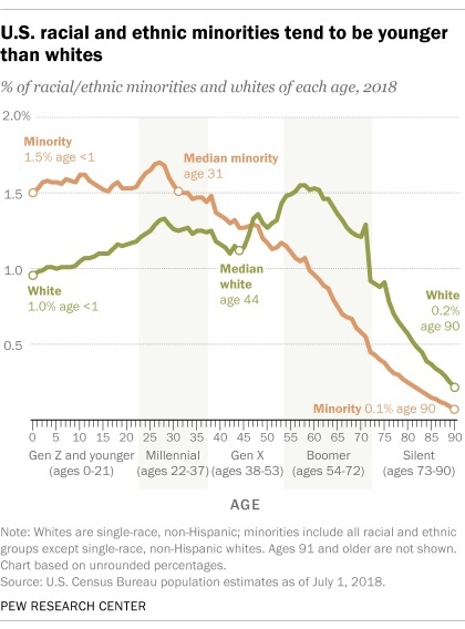 Однако, здесь скрыта ещё одна проблема исходного поста. В лучших традициях пропаганды, он задаёт тему дискуссии – преступность в зависимости от расы – и мы начинаем мыслить в её рамках. Но давайте посмотрим на данные внимательнее. Помимо рас (речь о которых впервые поднимается на 12 странице отчёта), рассматриваются и другие параметры. В таблице выше видно, что преступность также неоднородна по возрасту. Люди до 30 лет чаще нарушают закон, несмотря на малую численность, а почти люди старше 30 лет, составляющие почти 72% населения, совершают относительно небольшие 53,7% преступлений. Это логично: насильственные преступления скорее будут совершать буйные молодые люди, чем более взрослые. А теперь давайте взглянем на возрастную структуру населения США по расам: