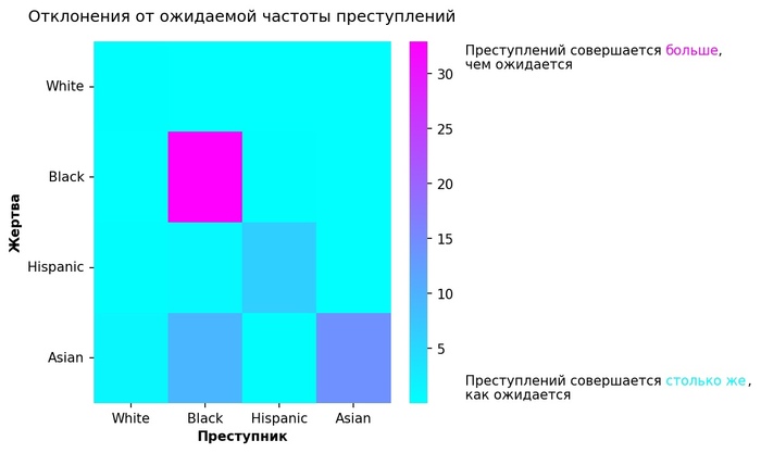 Символы крестов в ней стоят там, где есть значимые отличия от процента населения. Например, светлокожие совершают значимо меньше преступлений – 50,2%, хотя их в стране больше 60%, а темнокожие ответственны за 21,7%преступлений, составляя всего 12% населения страны