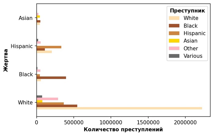 На графике представлены межрасовые насильственные преступления. Один из самых маленьких столбцов – количество преступлений, которые совершили белые против темнокожих. Однако по мнению автора картинки медиа заостряют внимание именно на этих случаях