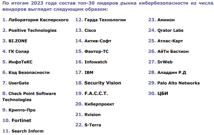 Лидерами рынка, с заметным отрывом от остальных участников, являются Лаборатория Касперского и Positive Technologies. К крупным игрокам на российском рынке кибербезопасности следует отнести BI.ZONE, ГК Солар, ИнфоТеКС, Код Безопасности и UserGate. В совокупности, все обозначенные крупные игроки покрывают более половины отечественного рынка кибербезопасности.