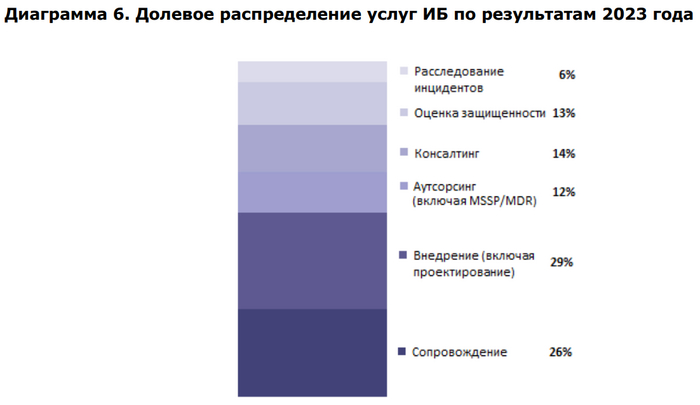 В ретроспективе, на протяжении трехлетнего периода наблюдения, отмечается тенденция существенного роста доли услуг по оценке защищенности, расследования инцидентов и постепенного снижения доли услуг консалтинга.