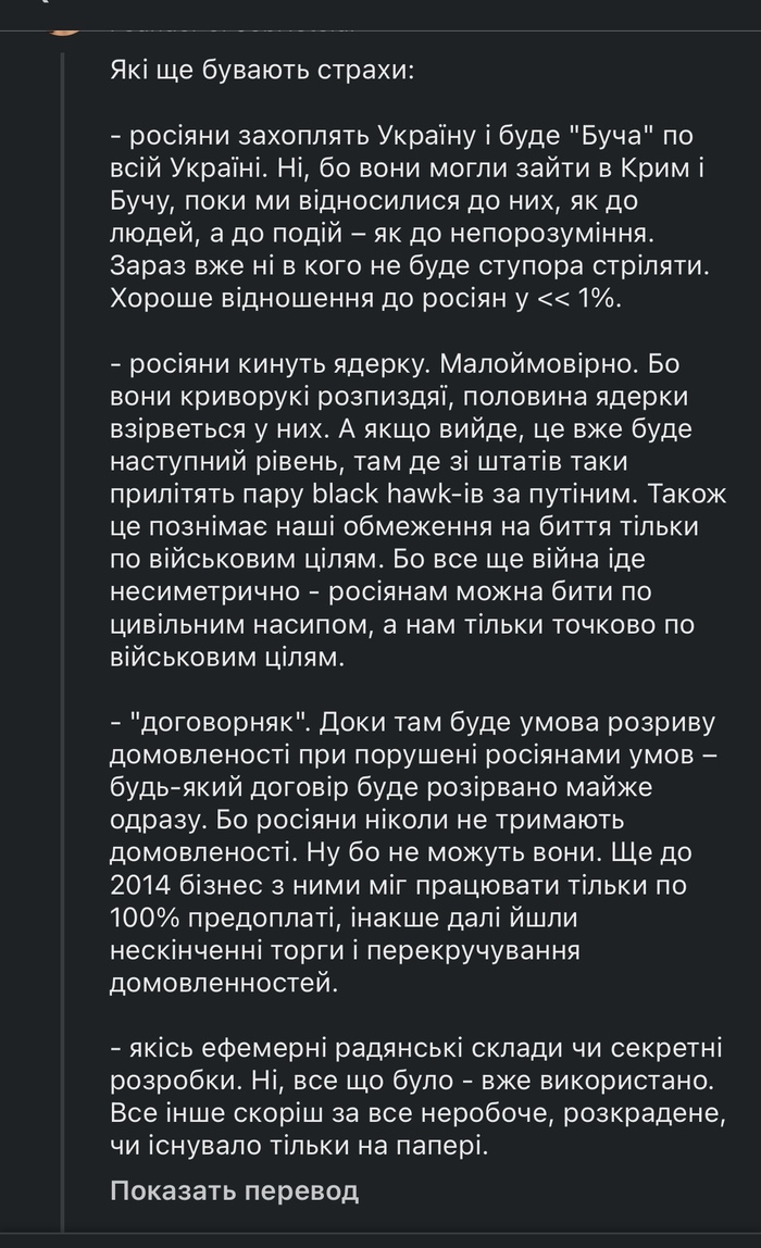 – россияне захватят Украину и будет “Буча” по всей Украине. Нет, потому что они могли зайти в Крым и Бучу, пока мы относились к ним, как к людям, а к событиям — как к недоразумению.
