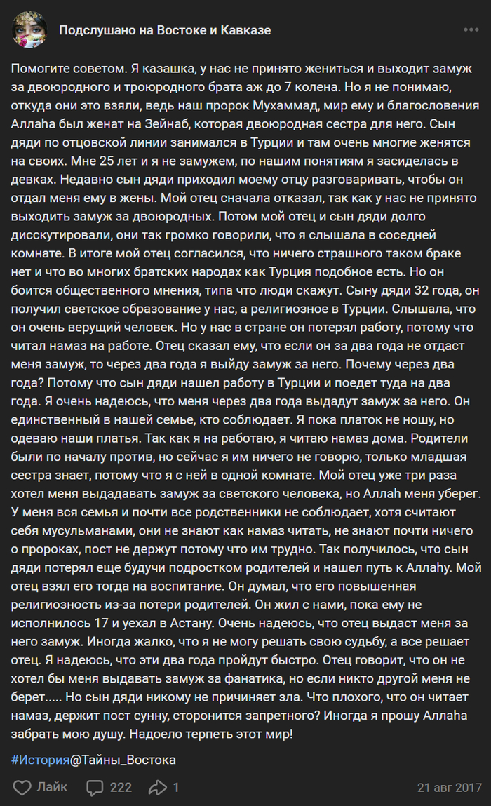 Бля пиздишь. У кипчакских тюркоязычных как казахи, башкиры, татары, киргизы инцест жестко табуирован на уровне кочевых традиций. У башкир есть такое понятие как шежере, по смыслу родословная, обычно ведут до 7 колена и хуй ты женишься на двоюродной, троюродной, четвертиюродной сестрёнке и тд. Смысл фиксации происхождения рода у казахов - примерно в этом же. Бля в жизни не поверю, что в казахской общине может быть инцест. Пиздишь как дышишь.