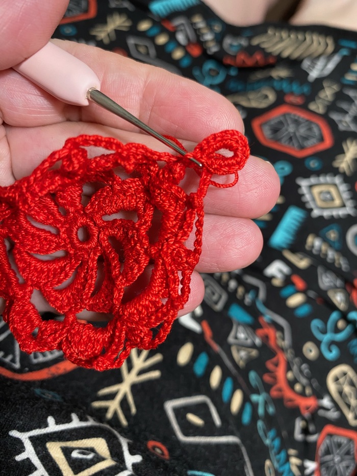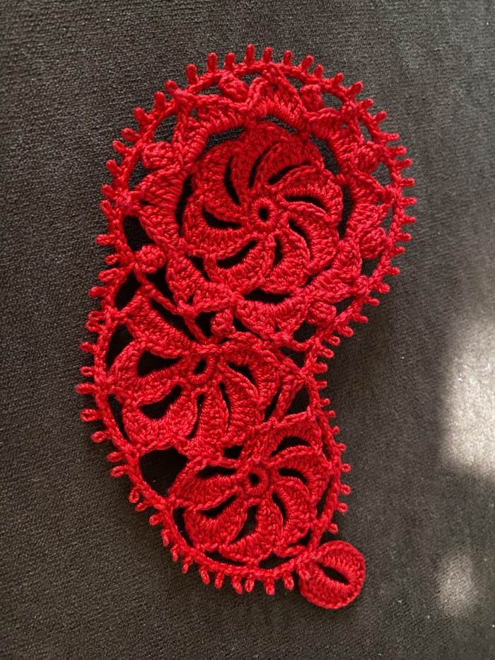 Сначала было слово появилась мысль поиграть с направлением вязания и с укороченными рядами. Мысль оказалась верной. В принципе, готовая деталь после пары-тройки перевязываний удовлетворила меня. И с учётом будущего натяжения детали в окне основы наконец получилось то, что задумывалось. Так как ловец состоял из трёх частей, то деталей нужно было шесть. Три красных и три чёрных. Для баланса, конечно же.