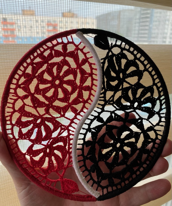 Металлические круглые основы с волнистым разделителем лежали в моих запасниках давно, но не было ни схемы, ни описания для вязания крючком половины символа "Инь-Ян". Кроме того, надо было точно попасть в размер металлической основы.
