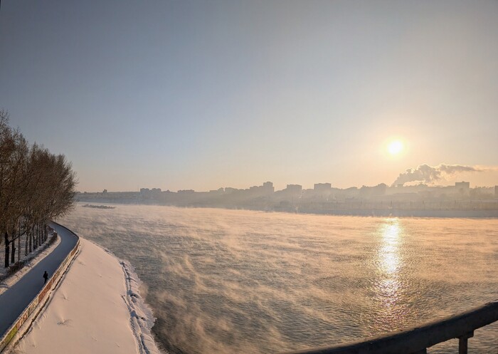 Эта фотография 2018 года всплыла сегодня из моего архива в подборке Google Photos про Иркутск. Морозный январский полдень, берег Ангары, на воде очень густой туман, впереди - пешеходный мост на остров Юность. Все вокруг выглядело очень призрачным, противоположный берег практически не просматривался.