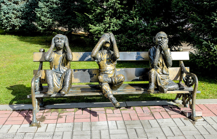 «Мидзару, кикадзару, ивадзару». Считается, что три обезьяны символизируют идею недеяния зла и отрешённости от неистинного. Японская мудрость: «Если я не вижу зла, не слышу о зле и ничего не говорю о нём, то я защищён от него».