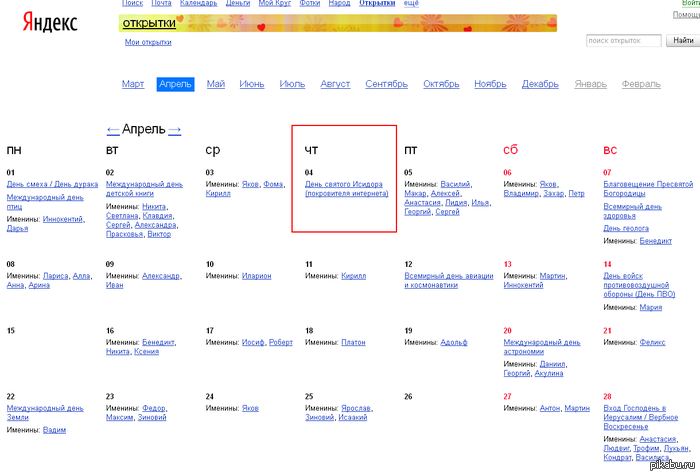skyzevs Исидор 12 лет назад http://cards.yandex.ru/calendar.xml?date=2013-04 Исидор Яндекс Идиотизм Придумал Шнягу