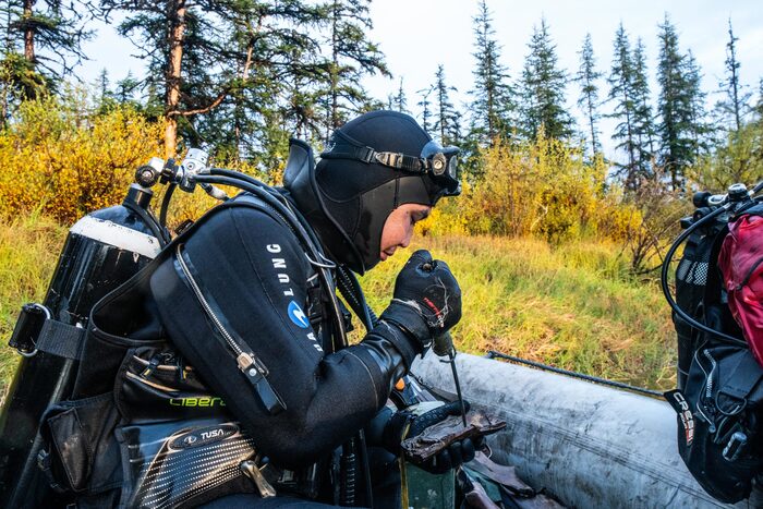 Сложно сказать, кто первым это придумал, однако способ оказался действенным. К тому же он мало кому доступен, так что конкурентов почти нет. В нашей команде ныряли двое: Ганя и Андрей, оба самоучки, которые в свое время купили водолазное оборудование и самостоятельно, без инструкторов, учились нырять в ближайших от дома озерах. Андрей, которому 24 года, обучился нырять за две недели пять лет назад. Бивни ищут в крайне опасных условиях, глубина притоков достигает семи — девяти метров, а температура воды в конце августа — начале сентября — восемь — десять градусов. Ищут в основном на ощупь, с железным щупом в руках: находят сопку на берегу, погружаются на дно у ее основания, после чего плывут по дну по течению, освещая путь мощными подводными фонарями. Вода в притоках мутная, особенно после дождей, и дно покрыто травой, так что видно не дальше вытянутой руки и всегда есть шанс зацепиться за корягу.
