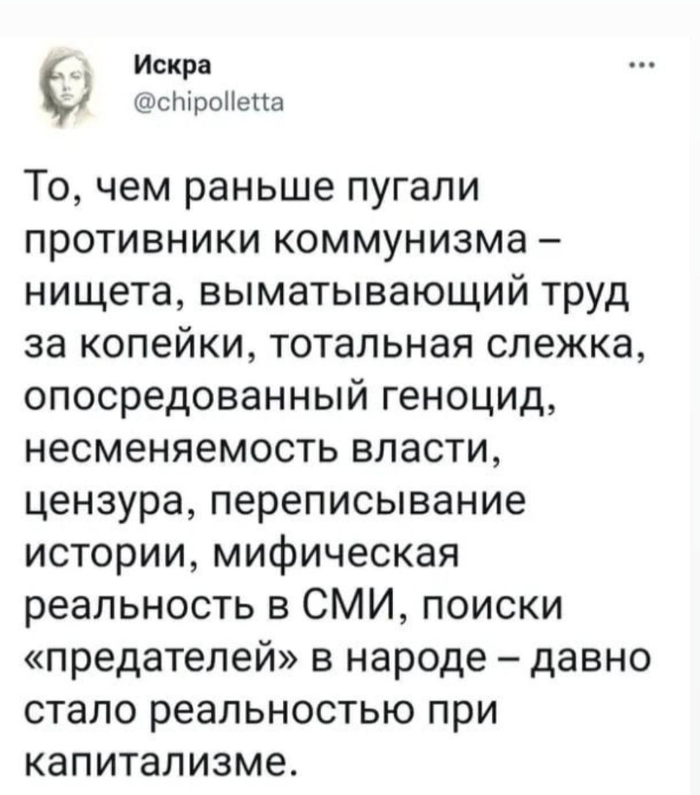 Есть группы леваков, которые спонсируются нашей же властью или нашими же буржуями, вроде профессора Попова или РКРП, всякие Бузгалины-Колгановы. Они всплыли как раз при Брежневе и Горбачеве. Им давали трибуну тогда, дают и сейчас. Их цель - заболтать используя блевотину с кафедр марксизма-ленинизма брежневного разлива.