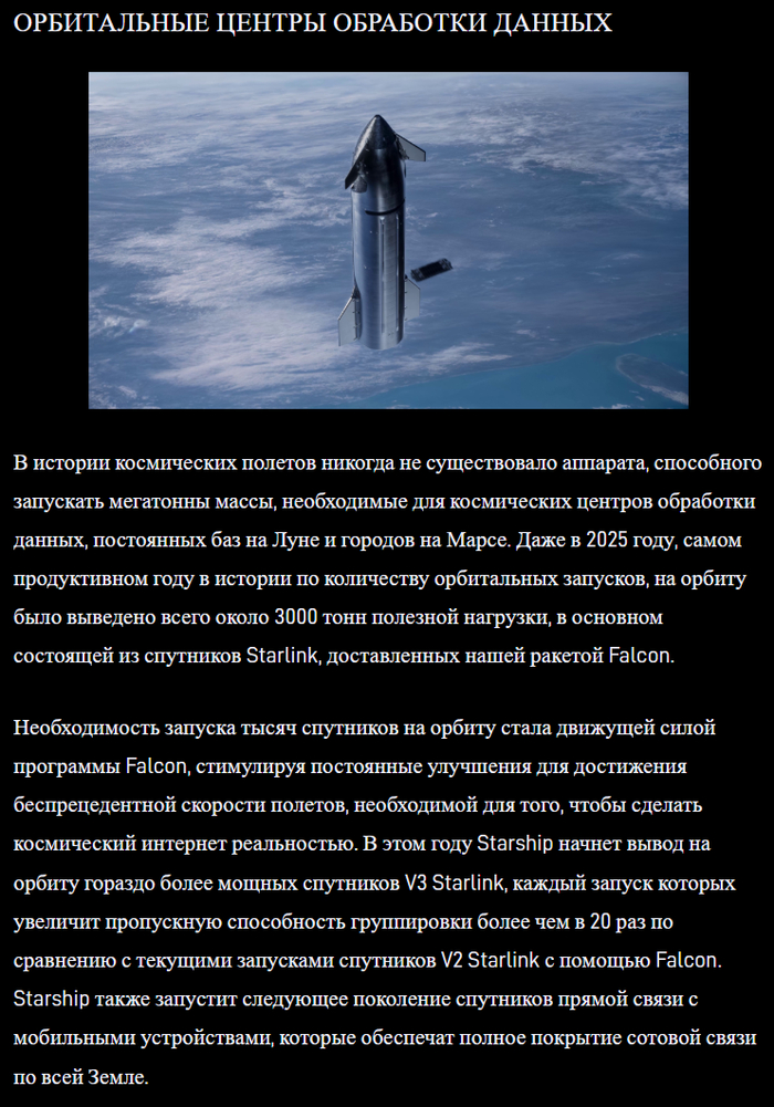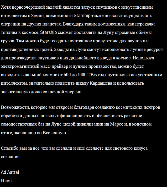 Маск убедительно доказывает, что только полному дебилу могло прийти в голову делать сверхтяжелую многоразовую ракету из углеволокна. Не называется лишь фамилия и имя этого дебила. Почему? Интересно же. Ведь, если послушать Маска, то это ключевой вопрос мировой повестки дня. США безнадежно проигрывают Китаю. Спасти США может только ИИ. Развитие ИИ в США невозможно без космических ИИ-дата-центров. А ракета, которая должна возить из в космос, не сделана из-за каких-то никчемных моральных уродов, которые заставили Маска потерять время на углеволокно. «Кто это сделал, лорды?»