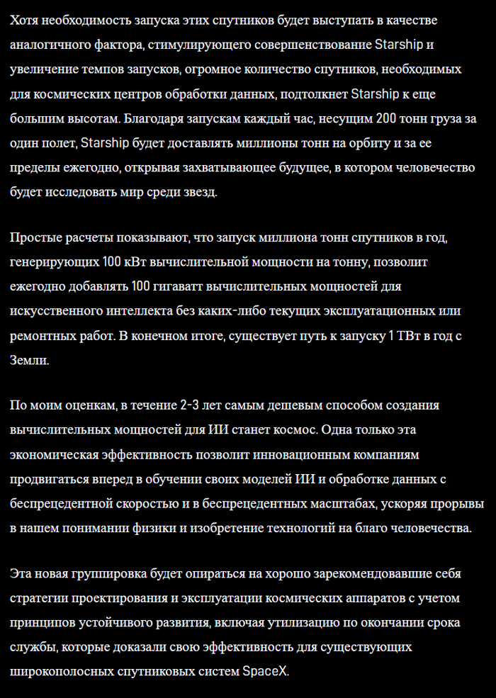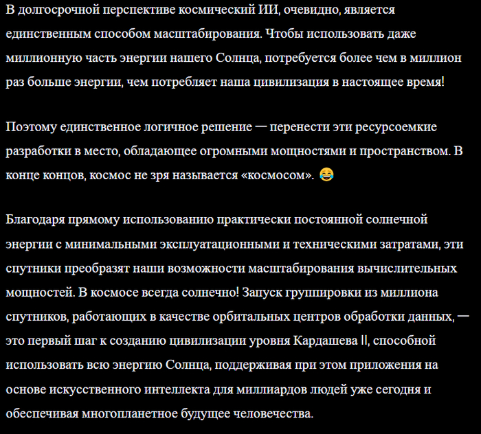 Что касается той части, где в интервью обсуждается яко бы существующая острая необходимость США немедленно выводить ИИ-дата-центры в Космос – могу только процитировать Вацлава Воровского про воображаемых собеседников: