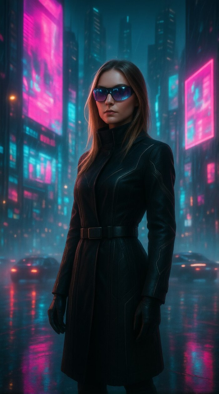 Ночной город: по небу парит металлическая птица, неоновые отблески отражаются на влажном асфальте, интенсивное дорожное движение, драйвовая музыка, плавная смена кадра к крупному плану птицы, акцент на ее светящихся механических глазах, стиль киберпанк, динамичный видеомонтаж, пульсирующие музыкальные ритмы.