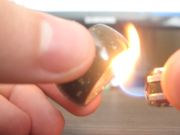 Так же искусственный камень не очень боится огня - после того, как я подержал кольцо над пламенем зажигалки около 10 секунд на кольце появились только 2 еле заметных пятнышка, которые чуть светлее основного цвета.