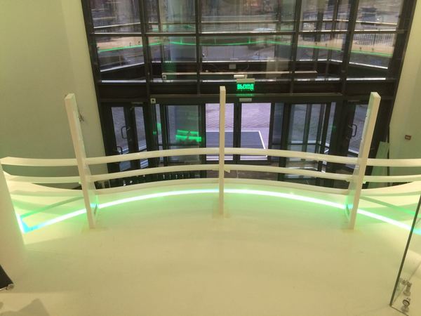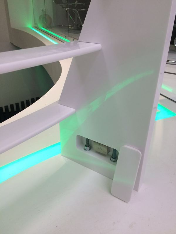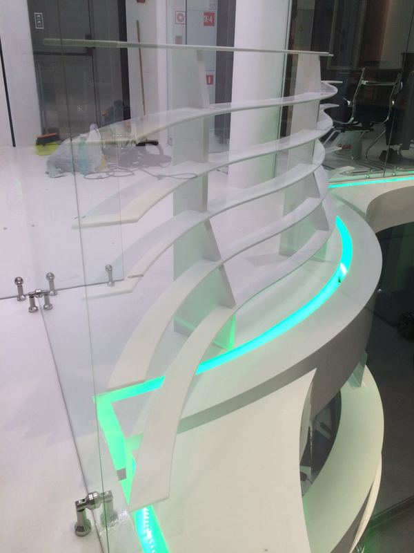 Процесс термоформинга проходит при температуре 175˚С. Минимальный внутренний радиус 75мм для материала толщиной 12мм, для 6мм – 25мм. При загибе на минимальный радиус или близкий к нему лучше сначала попробовать на небольшой заготовке, так как с наружной стороны вокруг крупных вкраплений могут появиться микротрещины.