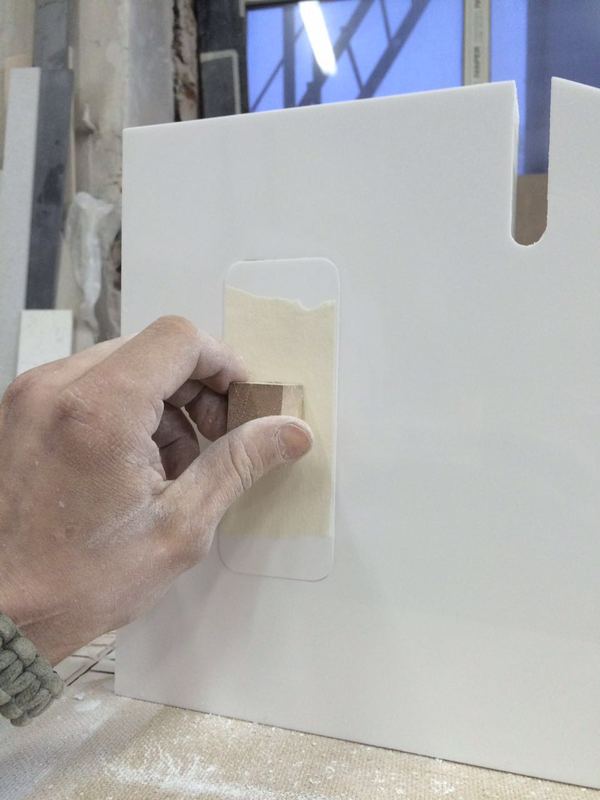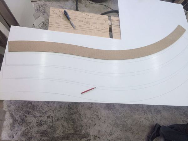 Особенностью этих цветов является неповторяющийся рисунок, имитирующий узоры природного камня. При сращивании деталей изделия шов будет заметен из-за несовпадения узора. Для того чтобы минимизировать эти расхождения узора, необходимо при раскрое листа учитывать расположение кромок и бортиков. Заготовки для кромок отрезаются от передней части листа, а для бортиков от задней. Оптимально если делать раскрой под углом 45˚ V – образной фрезой. Но это пригодно для прямолинейных деталей, для криволинейных деталей можно лишь пренебречь расхождением рисунка и объяснить клиенту, что иначе не получится. Этот процесс можно сравнить с подбором шпона для мебельных щитов – как ни старайся, а стык между пластами шпона все равно виден.