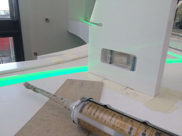 Если нужно соединить загнутую деталь с прямолинейной, то прямолинейную деталь необходимо нагреть при тех же условиях. Если этого не сделать, то может проявиться расхождение в цвете. Также необходимо учитывать, тот фактор, что швы будут просматриваться на просвет в виде теневой полосы, а также будут просматриваться детали каркаса. Минимизировать видимость швов можно за счет применения в качестве подложки или каркаса светопроводящих материалов, например прозрачного оргстекла. Швы располагать в местах прохождения элементов каркаса.