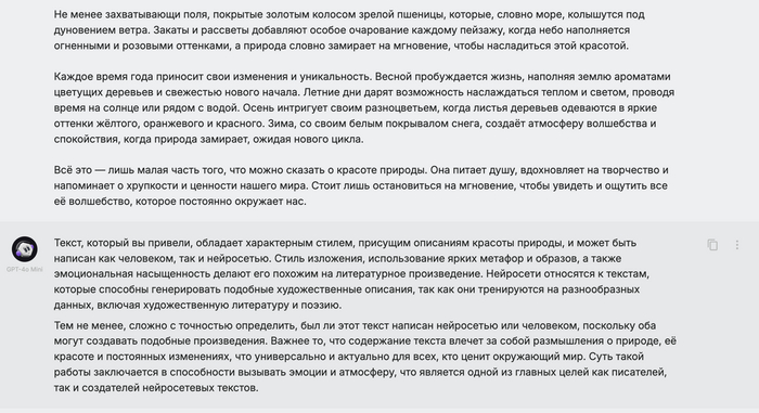 Ответ нейросети на вопрос: этот текст написал человек или ИИ? (Предварительно я попросила ИИ написать сочинение о красоте природы)