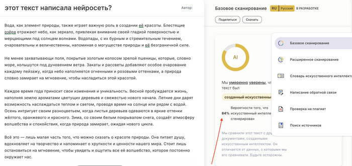Такой результат я получила, когда показала текст о природе, сгенерированный нейросетью, сервису GPTZero. С вероятностью 84% школьник бы получил двойку.