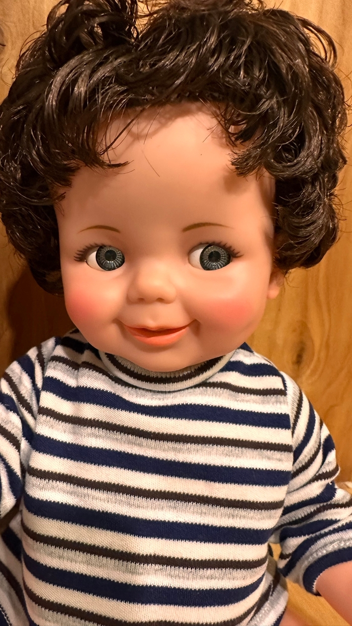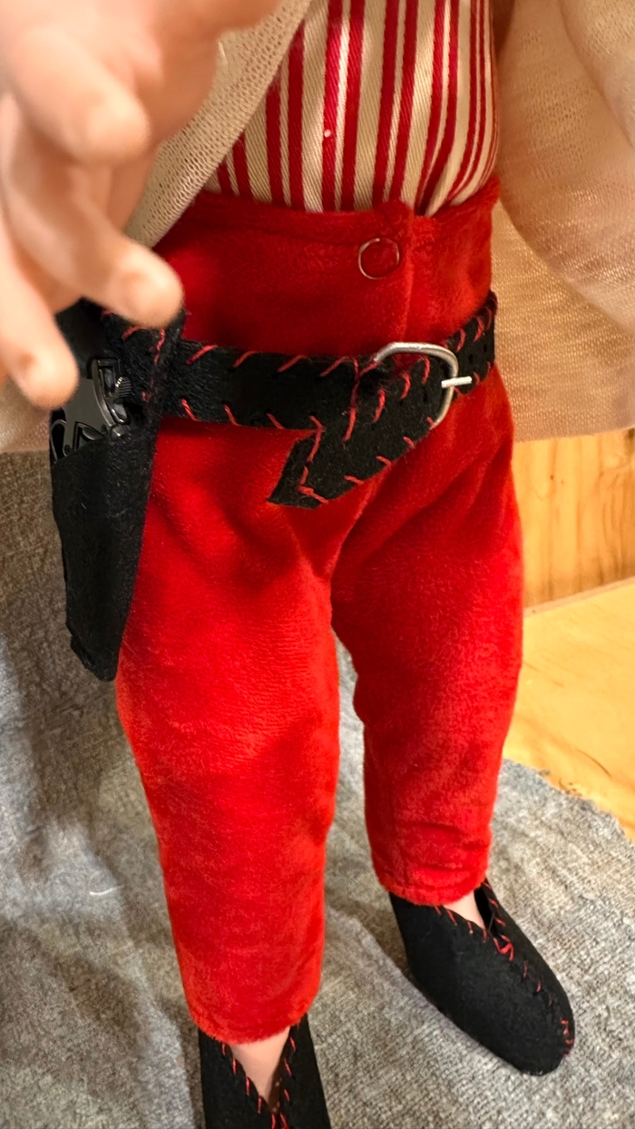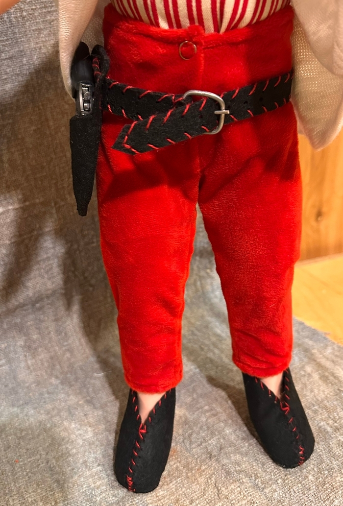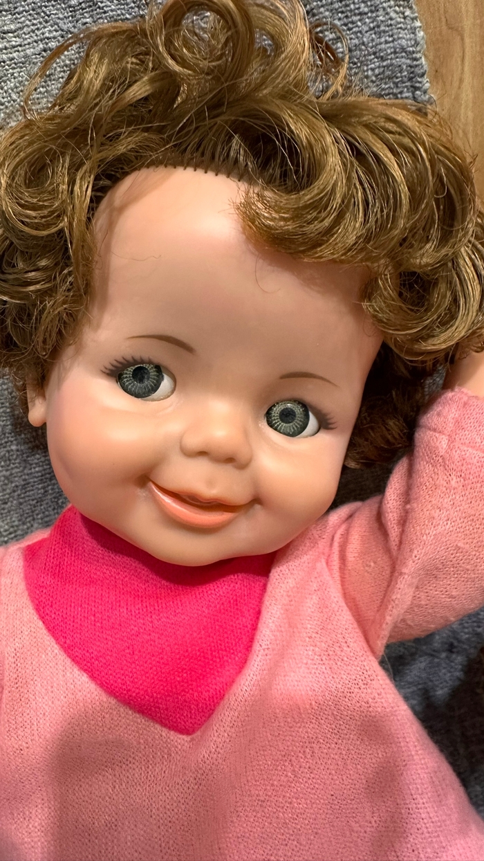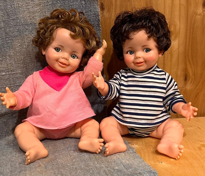 Работает так - пара ног жестко соединены между собой и подвешены на общую ось. Двигатель при вращении запускает маятник, который качает туловище куклы. В результате (в полном сборе - с головой и руками) кукла очень шустро перебирает ногами и бежит вперед враскачку.