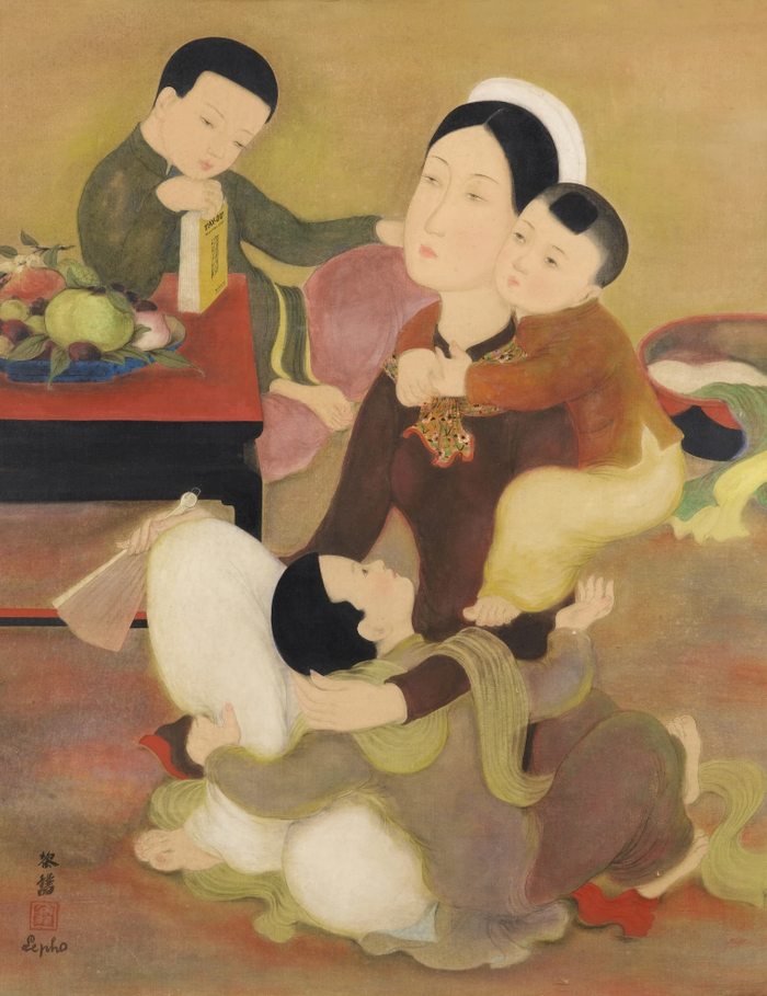 На картине изображена грациозная женщина из Северного Вьетнама 1930-х годов в традиционном аозай зеленого цвета, ухаживающая за двумя детьми. Лица трех фигур прекрасно прорисованы, и картина включает в себя яркие цветы, дополняющие картину счастливой и благополучной семейной жизни. Среди других примечательных особенностей его ранних картин на шелке можно отметить струящееся движение тканей.
