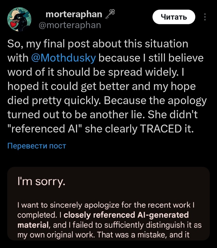 Другие художники подтверждают: @morteraphan опубликовала пост:"Моё финальное сообщение о ситуации с @Mothdusky. Её апология ещё одна ложь. Она не 'референсировала AI', она явно ТРАССИРОВАЛА".