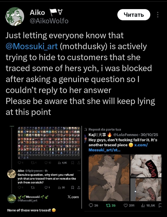 @Mossuki_art (mothdusky) скрывает от клиентов, что трассировала YCH. Меня заблокировали после одного вопроса".