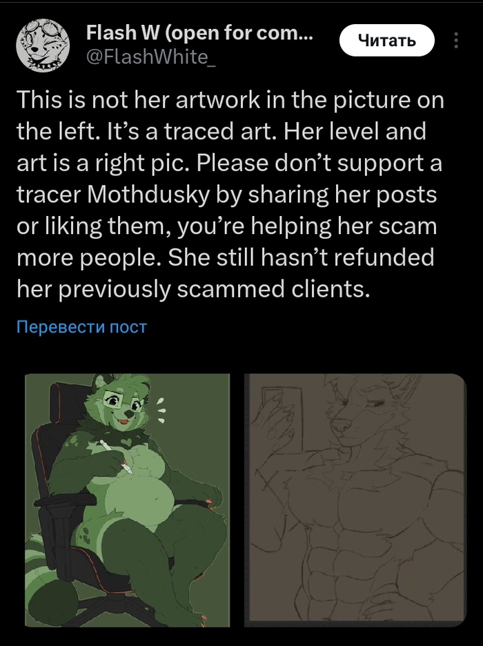 @FlashWhite_ показал сравнение: "Это не её слева трассированное искусство. Её уровень справа. Не поддерживайте трассера Mothdusky, вы помогаете ей обманывать больше людей".