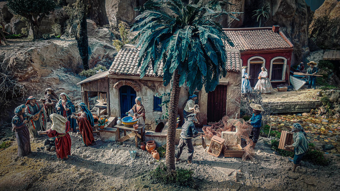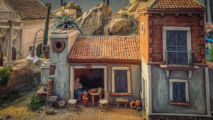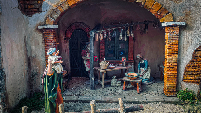 Искусная, поразительно детализированная панорама по мотивам Рождества. Фотографией весьма затруднительно передать атмосферу этого произведения ручного труда художников.