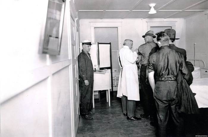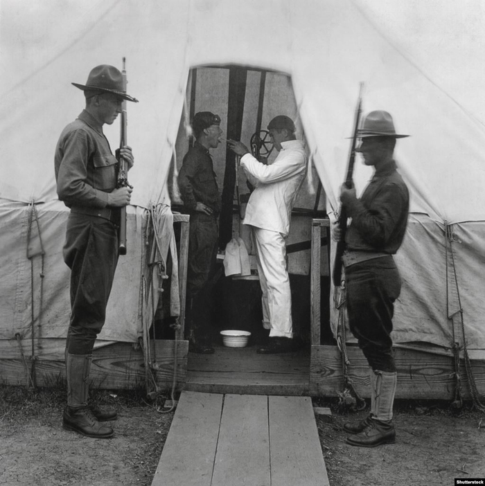 Военнослужащие полощут горло соленой водой на американской военной базе. Считалось, что соленая вода предохраняет от заражения гриппом. Трудно установить, откуда появилось это спорное утверждение.