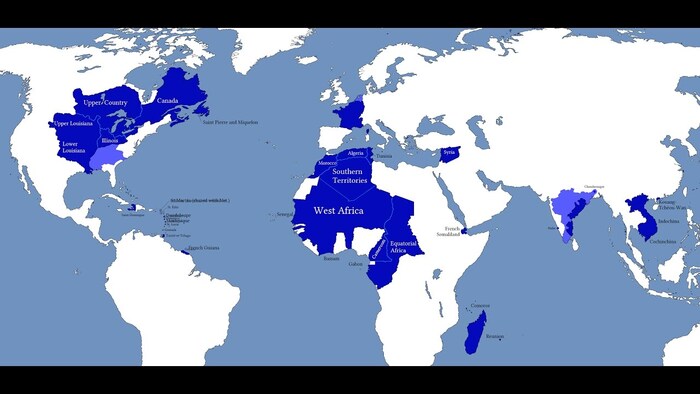 Конечно, французы, они немного опоздали в колониальную игру. На карте показаны различные территории и колонии, которые в какой-то момент контролировались Францией. Обратите внимание, что карта действительно включает очень краткие европейские завоевания Наполеона, они просто не длились достаточно долго, чтобы их учитывать. Интересный факт: Франция сегодня — страна с наибольшим количеством часовых поясов. Это был вопрос на викторине (так правильно говорить "trivia night"?) в пабе, и в моей команде я был единственным, для кого ответ был очевиден)