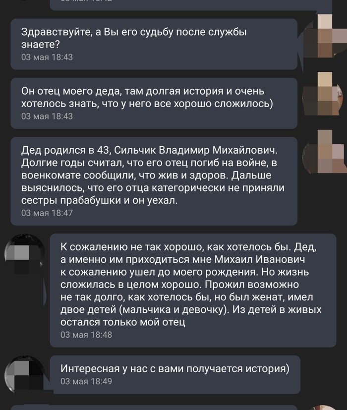 Мне было лет 7, когда я задалась вопросом где муж прабабушки. Она войну пережила, много рассказывала и где-то в моей голове отложилось, что он не пережил. Лет в 15, когда ее уже не стало и спросить толком не у кого, мне поведали, что познакомились они на фронте, в самом начале войны, в 44 появился дед. В 45 его отец приехал к нему. Войну отношения прошли, а вот встречу с сестрами прабабушки - нет. Загнобили его так, что собрал сумку и ушел вникуда. Почему жена не ушла с ним узнать уже не можем, но много лет я мечтала узнать судьбу прадеда. Хоть коротко, хоть со сводок, главное, что б после всего этого с ним все хорошо было. Искала везде, поднимала архивы и прочее. Даже тут пост писала. А тут вечером решила просто посмотреть в ВК по фамилии