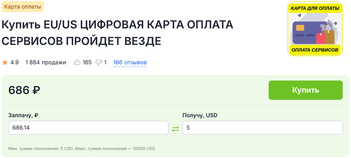 Есть и другой путь — купить виртуальную карту с уже зачисленным балансом на маркетплейсе ggsel. Перед оформлением указываете нужную сумму, оплачиваете в рублях, и на карте сразу будет эквивалент в иностранной валюте, готовый для оплаты ChatGPT Plus.