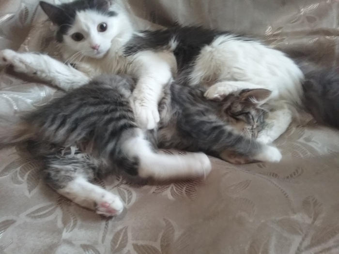 Там в сугробе, я их и нашла. Принесла домой в охапке, а пока я металась в поисках грелок, произошло волшебство: мои собственные коты легли прямо на этот мокрый ледяной комок из кошки и котят и принялись вылизывать и согревать его. Так Мила и трое ее выживших малышей обрели семью.