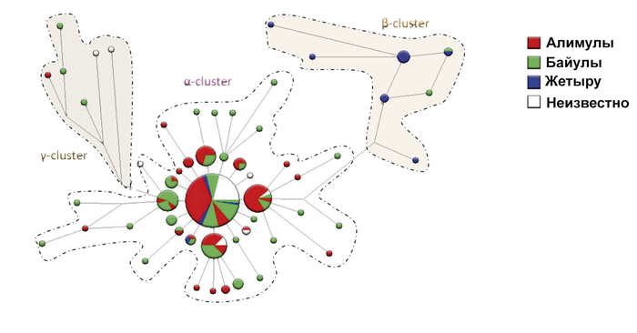 В кластер α, возрастом 700 ± 200 лет, вошли представители племенных объединений алимулов и байулов, тогда как представители жетыру в основном встречаются в кластере β.