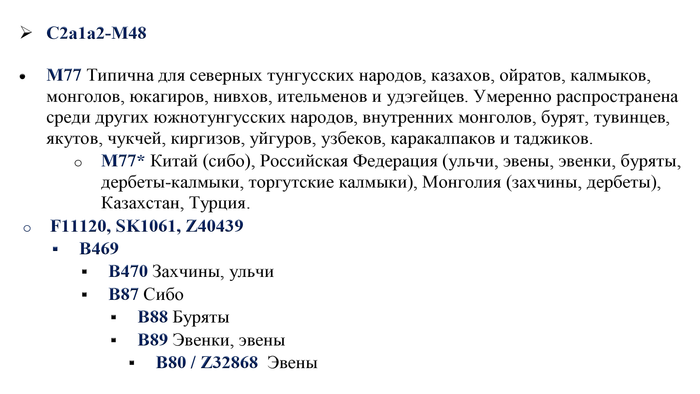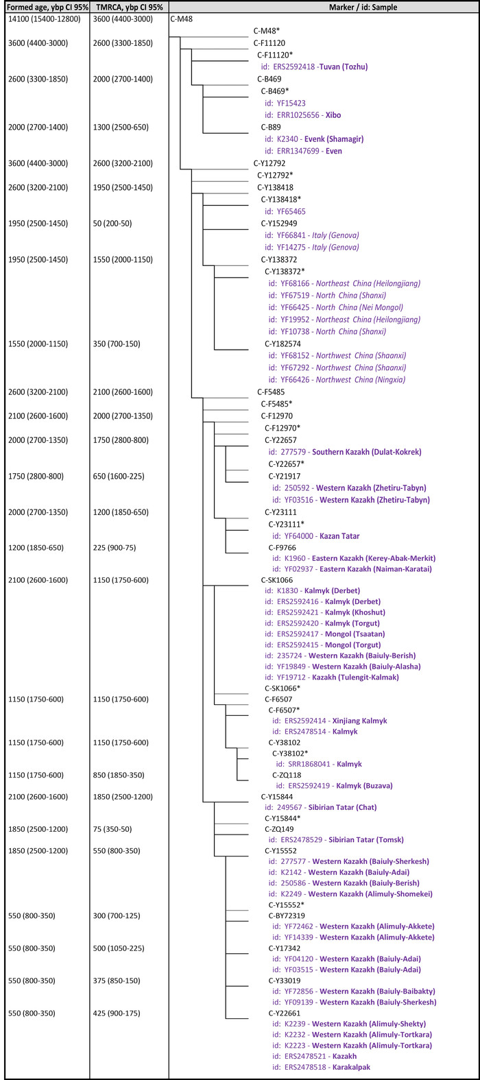 B90 характерна для популяций северо-востока Сибири, а M77 для Центральной и Северной Азии. Ветвь M77, в свою очередь, дала начало двум подветвям: Z40447 и F6379. Подветвь Z40447 распространена среди тунгусоязычных эвенов и эвенков, а также монголоязычных бурят и монголов, а F6379, характерна для калмыков и ойратов. К этой подветви относится и субклад F5485, который обнаружен у 50 линий западных казахов, исследованных с высоким разрешением. Сеть, построенная по маркерам коротких тандемных повторов гаплогруппы C2a1a2-M48, совпадает с субветвями, а они в свою очередь подразделяются на кластеры.