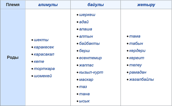 Первая гипотеза предполагает, что 6 родов алимулов, 12 байулов и 7 жетыру, возникли независимо друг от друга и соответственно без общего предка по мужской линии.