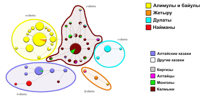 Три из них (α, β и γ) соответствуют кластерам филогенетической сети, построенной для западных казахов. Кластер α, образуют алимулы и байулы, кластер β образуют представители рода табын, племени жетыру, а кластер γ, гораздо шире и охватывает калмыков, монголов, сарт-калмыков и казахов из рода берш племени байулов. Кластер ε образован племенем дулат Старшего жуза, а кластер δ включает алтайских казахов и восточных казахов племени найманов Среднего жуза.