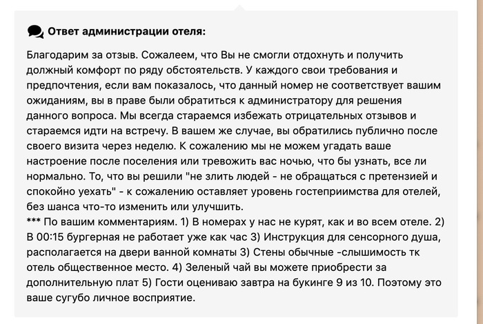 Пару лет назад останавливалась по дороге на юг в одном отеле. Номер выглядел симпатично на фото, но разочаровал в реальности, о чем честно написала отзыв на букинге. Недавно увидела, что мне ответили - в довольно своеобразной манере, и решила посмотреть другие ответы администрации.
