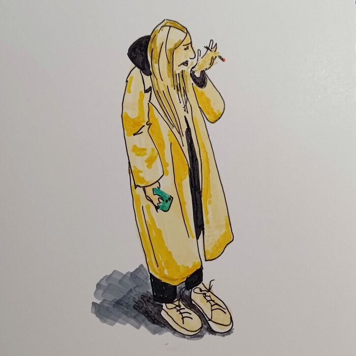 Девушка в белом пальто стоит за задворках Лиговского проспекта с бирюзовым айфоном, ждёт кого-то и капризно курит через запястье. Курсант чего-то морского идёт нестроевым шагом куда-то вдаль и отбрасывает длинную утреннюю тень.