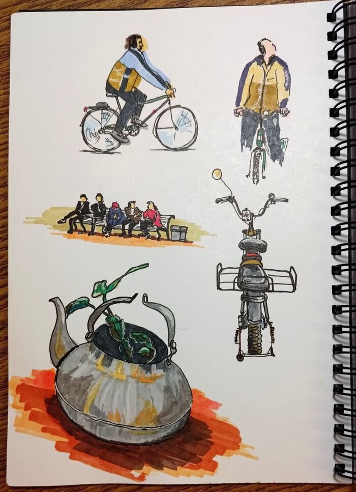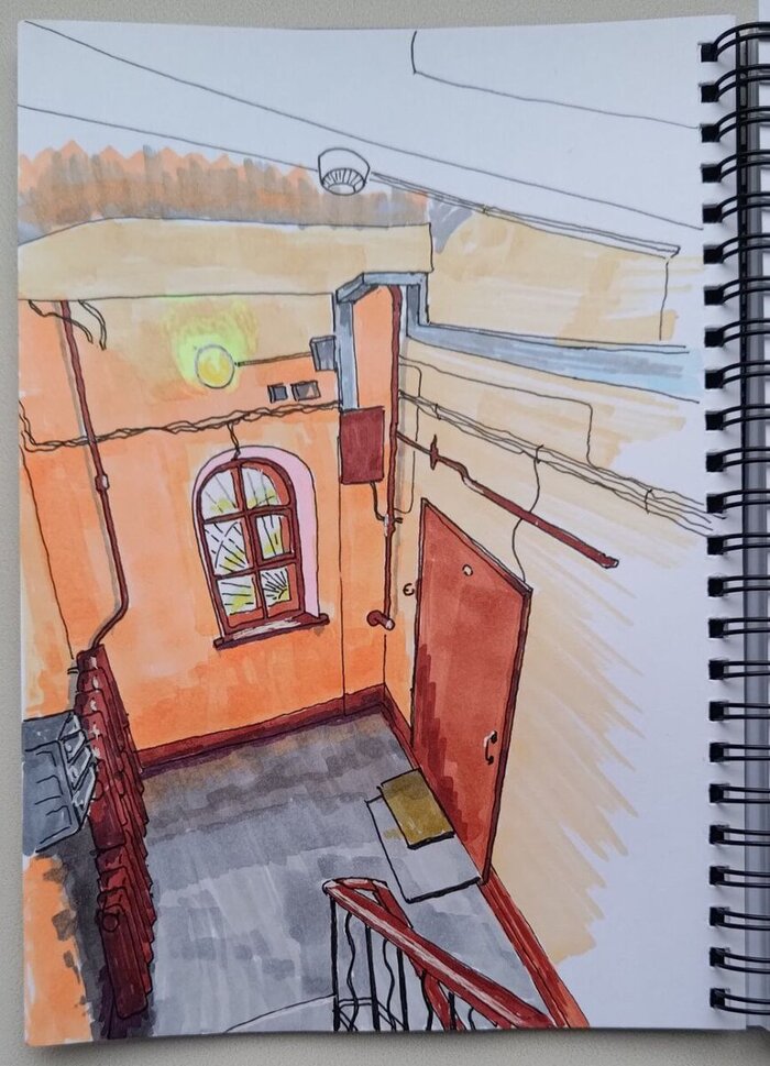 На листе с несколькими зарисовками я попал на Гороховую в день питерского температурного максимума. Если вы не в курсе, то у нас на днях было +21, и предыдущий максимум был +16,7 в 1890 году. Так что у нас значительно потеплело, но эта информация вам все равно не пригодится. Если поедете в Питер — берите шарф. Там же на Гороховой я зашел в парадную — видите парадную? — и в парадной на подоконнике был чайник с цветком — видите чайник?
