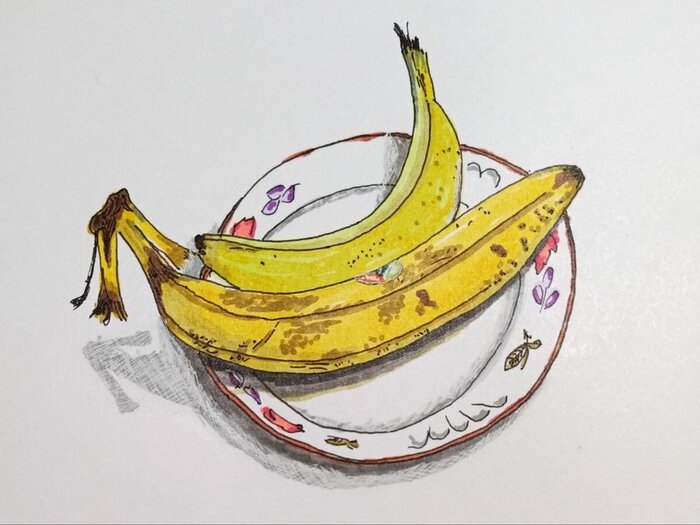 А ещё есть тарелка с бананами. Для одного из бананов это фактически постмортем. У нас дома всегда есть банан, который не доедается. Хоть три купи, хоть семь — один обязательно долежит до черноты и выбросится. Вот это именно он. Банан по имени смерть.