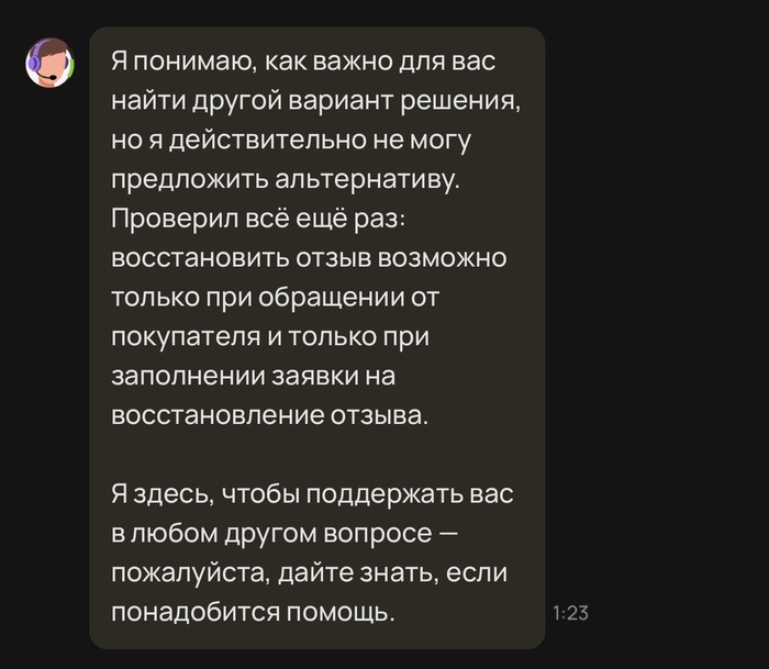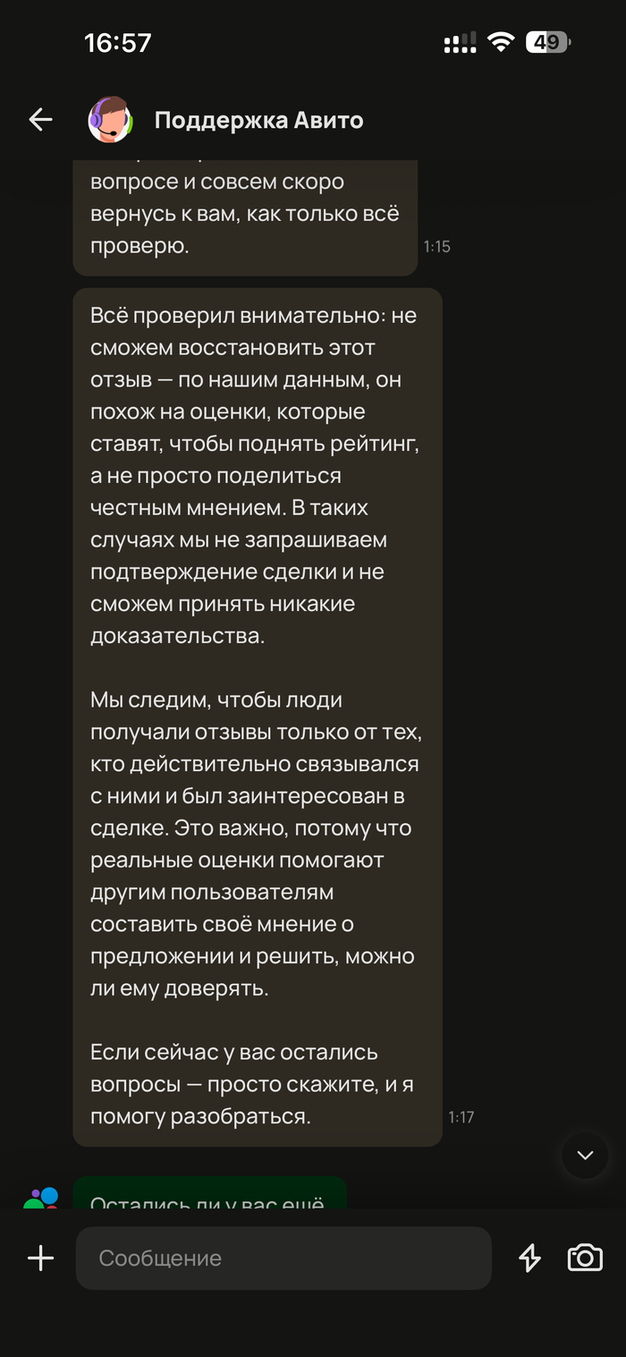 Пару дней назад клиент оставил в моем профиле отзыв после выполненной работы, его приняли, выложили все хорошо, через часа 3-4 он пропадает. Я пишу в поддержку, мне конечно же отвечают шаблонным текстом что "система чё то там увидела, она у нас самая крутая и ничем помочь не можем", но я абсолютно уверен в подлинности этого отзыва, есть всё, переписки, звонки, даже записи этих звонков, перевод от клиента и тому подобное. Поддержка авито тупо игнорирует все доказательства, осталось приехать только к клиенту и на видео записать от начала до конца все подтверждения, я не знаю. И почему обжаловать отзыв должен заказчик? Че за бред? Ему больше заняться нечем? Но я почему то уверен, что если заказчик и найдет время это сделать, то изменений не будет, уже не первый раз такое, и я оставлял бывало отзывы, их удаляли и обжаловать не получалось)
