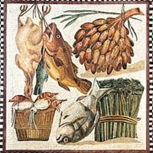 Среди многочисленной еды, римлянами, прежде всего, ценилась рыба. Рыба была дорогой, и поэтому пользовалась популярностью среди аристократов. Самой дорогой рыбой считалась краснобородка. Далее шли следующие виды: морской угорь, камбала. Менее ценились: угорь обыкновенный, морская щука – они были популярны среди обычных, небогатых горожан. Также нельзя оставить без внимания моллюски: murex (съедобная улитка), ракушки, устрицы. Употребляли не только свежую, но и соленую рыбу. Солились, в основном, осетр, тунец. Соленую рыбу использовали как закуску, поэтому ее подавали, приправленную оливковым маслом, уксусом.