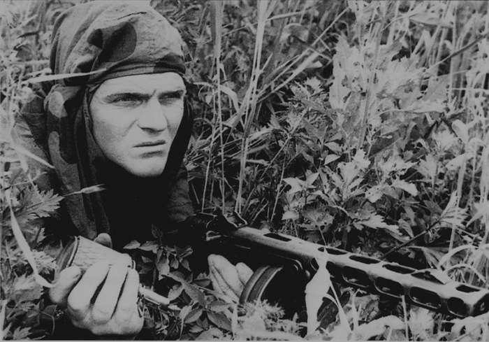 Командир советского партизанского отряда с пистолетом-пулеметом ППШ в Крыму. Фото - Виктор Темин, 1942