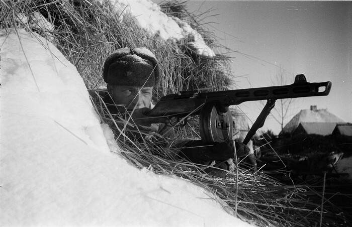 Красноармеец целится из пистолета-пулемета ППШ-41 в Сталинграде. Авторское название фотографии "Пехотинец". Фото - георгий Зелма, январь 1943